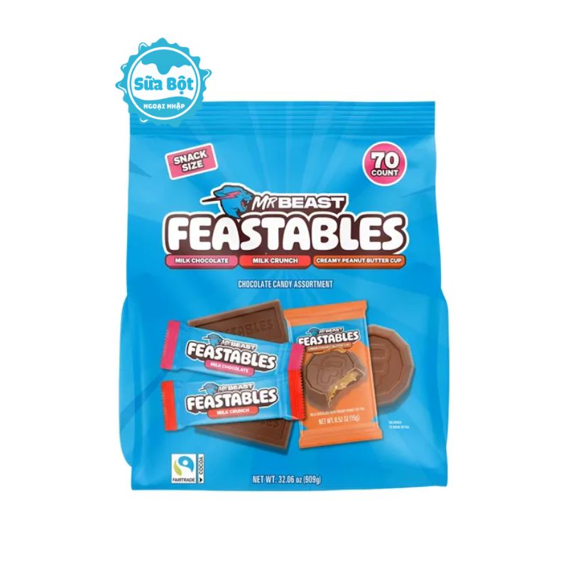 - Bịch socola MrBeast Feastables 175g cung cấp vị Milk Chocolate mềm béo kiểu truyền thống cho cảm giác tan chảy trong từng miếng cắn. MrBeast Feastables 909g ngoài vị Milk Chocolate còn có Milk Crunch có thêm hạt giòn ăn thơm thơm bùi bùi, Peanut Butter Cup với socola nhân bơ đậu phộng mặn mặn ngọt ngọt thưởng thức siêu hấp dẫn.